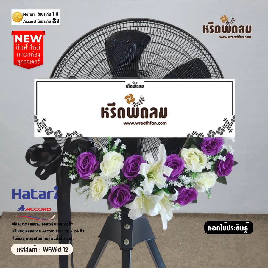 พวงหรีดพัดลมอุตสาหกรรม ประดับดอกไม้สด โทนสี ขาว-ม่วง จัดตามแบบ หรือเปลี่ยนโทนสีได้ เลือกสีพัดลมได้ (กรุณาสอบถามก่อนสั่งซื้อ) นะคะ (สินค้าใหม่แกะกล่อง)
