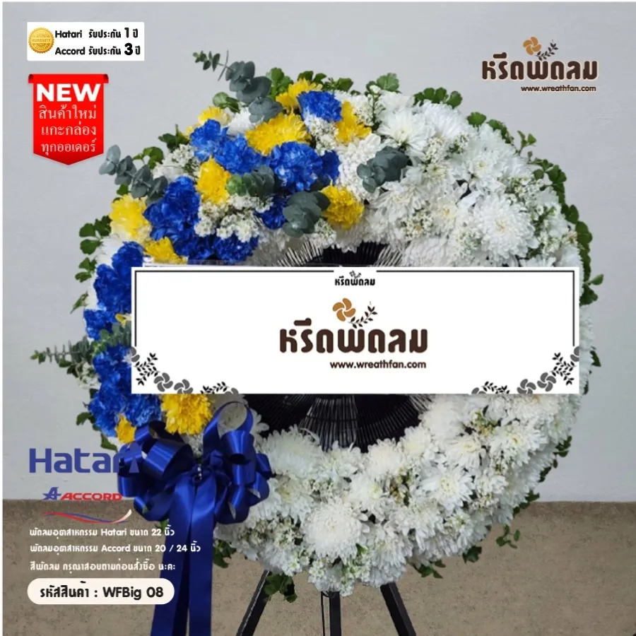 พวงหรีดพัดลมอุตสาหกรรม ประดับดอกไม้สด โทนสี ขาว-น้ำเงิน-แซมเหลือง จัดตามแบบ หรือเปลี่ยนโทนสีได้ เลือกสีพัดลมได้ (กรุณาสอบถามก่อนสั่งซื้อ) นะคะ (สินค้าใหม่แกะกล่อง)