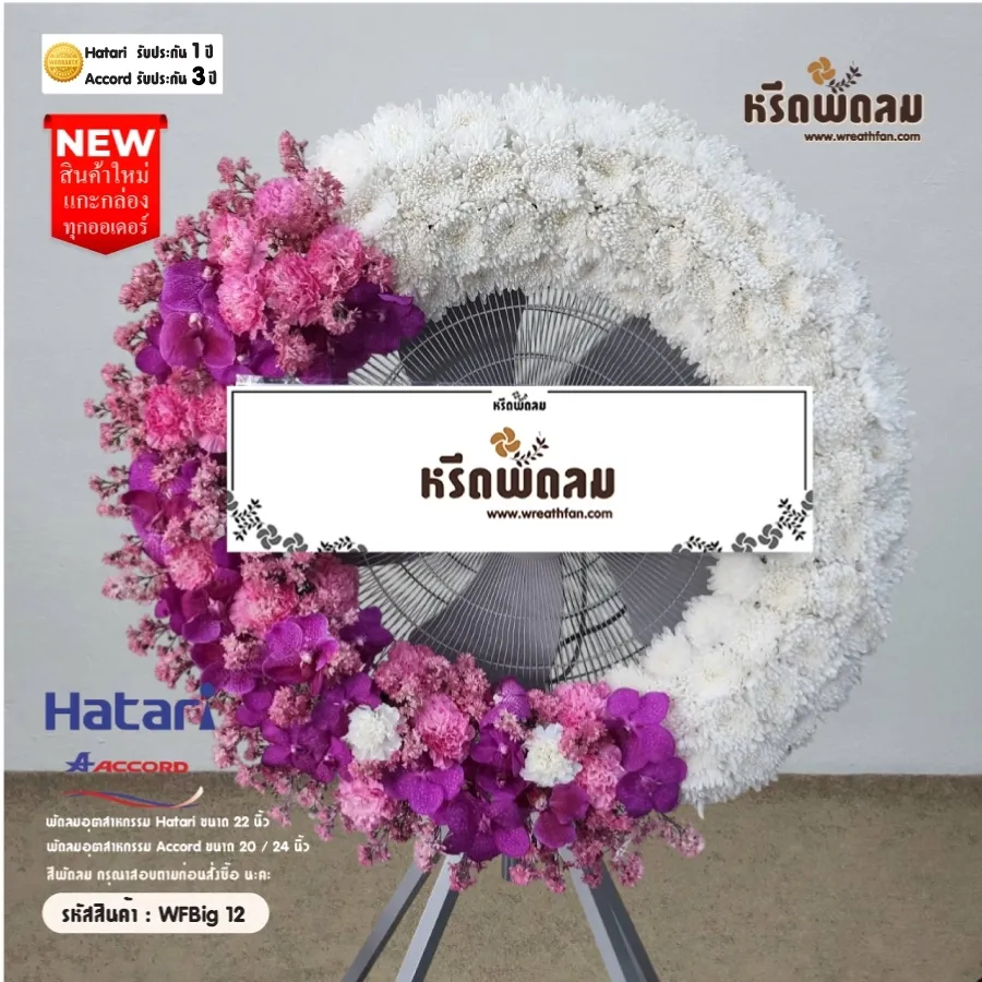 พวงหรีดพัดลมอุตสาหกรรม ประดับดอกไม้สด โทนสี ขาว-ม่วง จัดตามแบบ หรือเปลี่ยนโทนสีได้ เลือกสีพัดลมได้ (กรุณาสอบถามก่อนสั่งซื้อ) นะคะ (สินค้าใหม่แกะกล่อง)