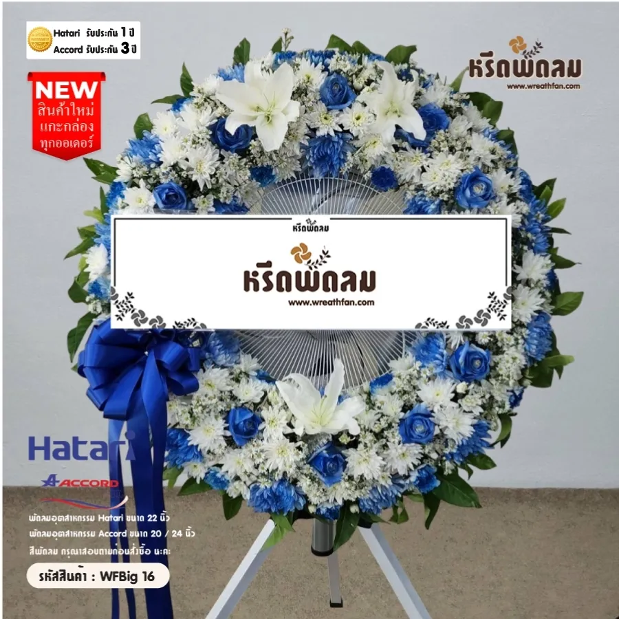 พวงหรีดพัดลมอุตสาหกรรม ประดับดอกไม้สด โทนสี ขาว-น้ำเงิน จัดตามแบบ หรือเปลี่ยนโทนสีได้ เลือกสีพัดลมได้ (กรุณาสอบถามก่อนสั่งซื้อ) นะคะ (สินค้าใหม่แกะกล่อง)