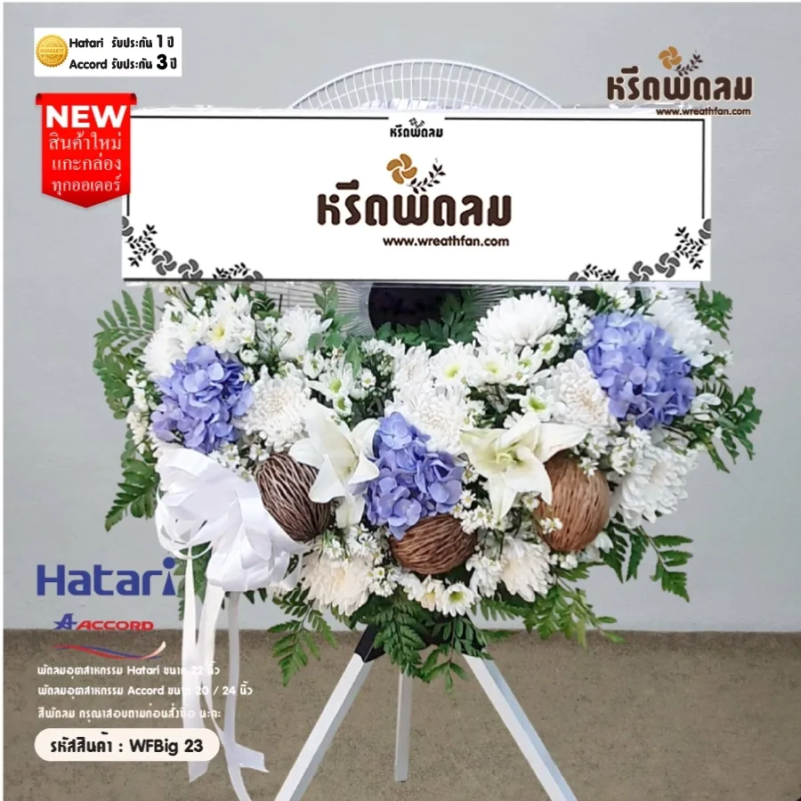 พวงหรีดพัดลมอุตสาหกรรม ประดับดอกไม้สด โทนสี ขาว-ฟ้า จัดตามแบบ หรือเปลี่ยนโทนสีได้ เลือกสีพัดลมได้ (กรุณาสอบถามก่อนสั่งซื้อ) นะคะ (สินค้าใหม่แกะกล่อง)