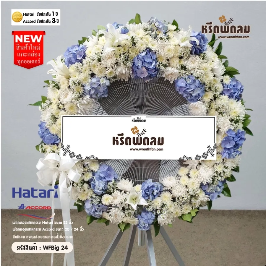 พวงหรีดพัดลมอุตสาหกรรม ประดับดอกไม้สด โทนสี ขาว-ฟ้า จัดตามแบบ หรือเปลี่ยนโทนสีได้ เลือกสีพัดลมได้ (กรุณาสอบถามก่อนสั่งซื้อ) นะคะ (สินค้าใหม่แกะกล่อง)