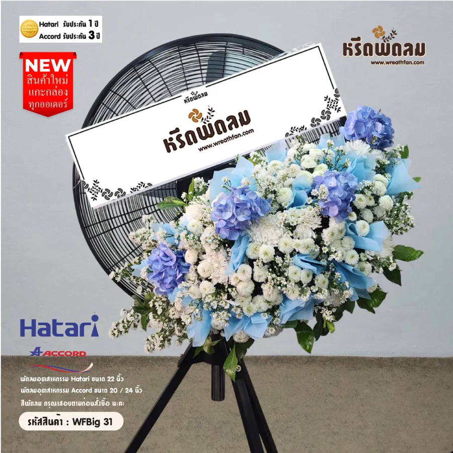 พวงหรีดพัดลมอุตสาหกรรม ประดับดอกไม้สด โทนสี ขาว-ฟ้า จัดตามแบบ หรือเปลี่ยนโทนสีได้ เลือกสีพัดลมได้ (กรุณาสอบถามก่อนสั่งซื้อ) นะคะ (สินค้าใหม่แกะกล่อง)
