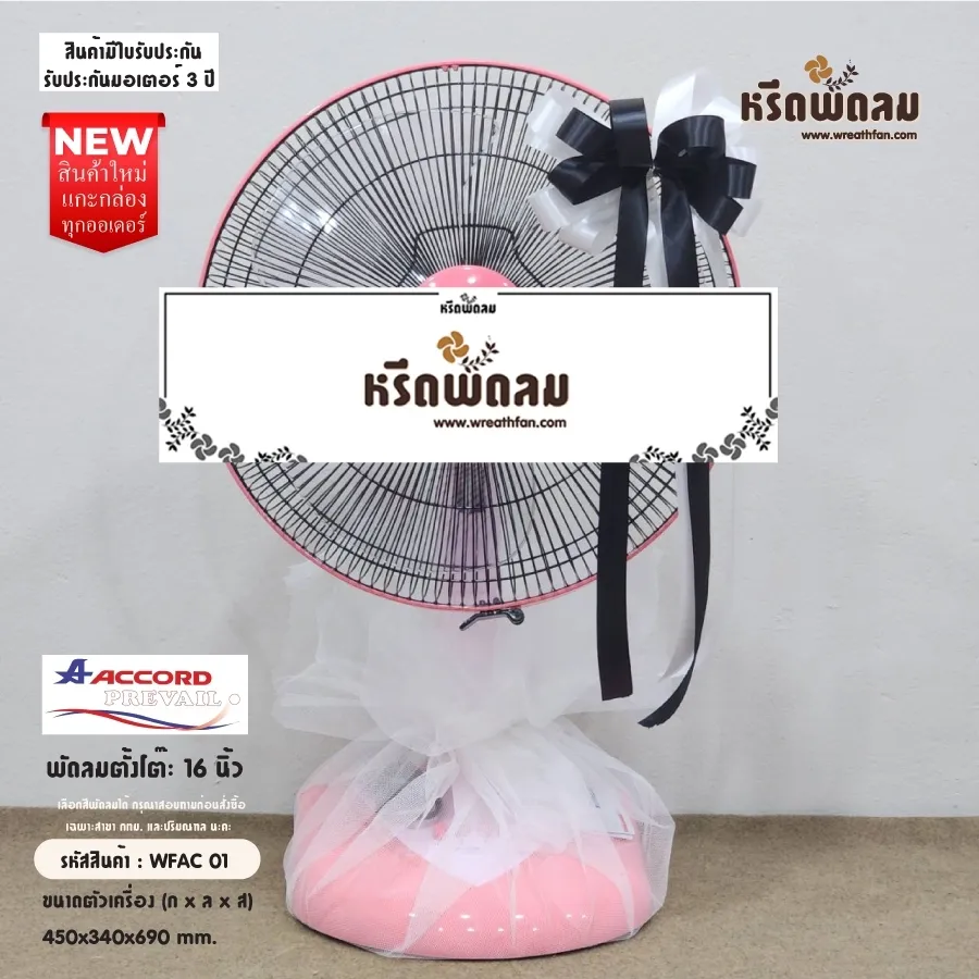 พวงหรีดพัดลม ยี่ห้อ Accord ขนาด 16 นิ้ว ประดับริบบิ้น โทนขาวดำ จัดตามแบบ หรือเปลี่ยนโทนสีได้ เลือกสีพัดลมได้ (กรุณาสอบถามก่อนสั่งซื้อ)