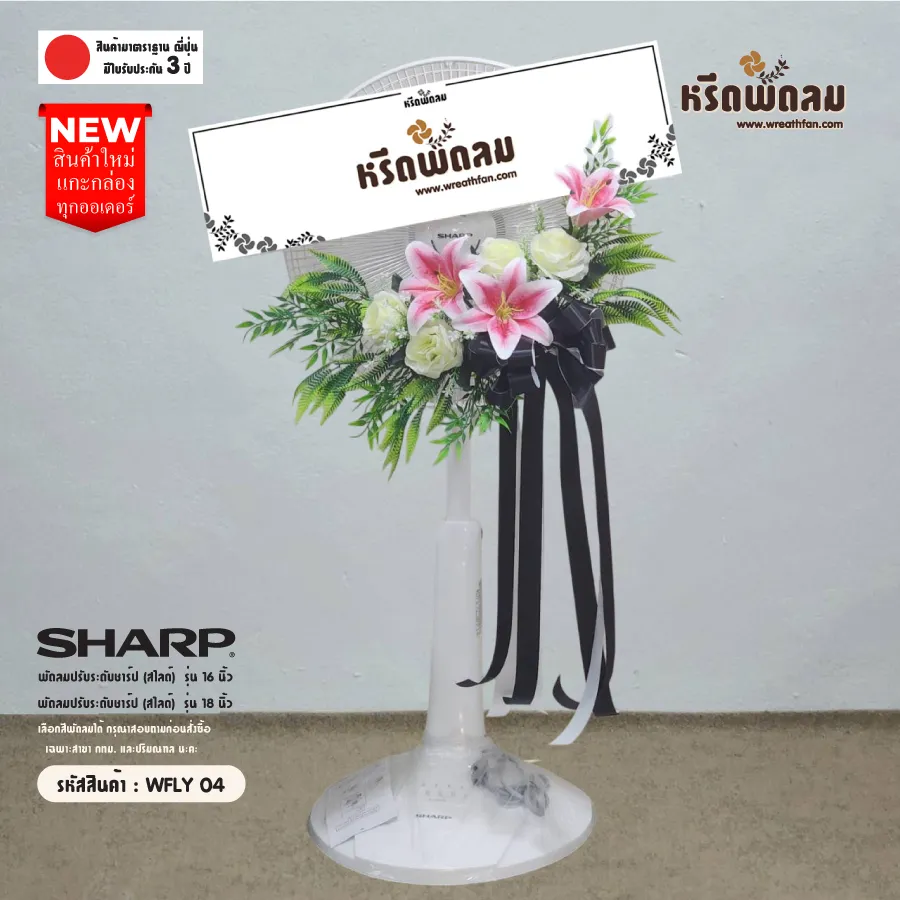 พวงหรีดพัดลมยี่ห้อ SHARP ขนาด 16 นิ้ว และ 18 นิ้ว ประดับดอกไม้ประดิษฐ์ โทนสีขาว-เขียว-ชมพู และริบบิ้นสีขาว-ดำ จัดตามแบบ หรือเปลี่ยนโทนสีได้ เลือกสีพัดลมได้ (กรุณาสอบถามก่อนสั่งซื้อ)