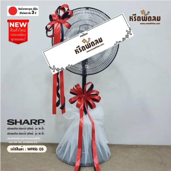พวงหรีดพัดลมยี่ห้อ SHARP ขนาด 16 นิ้ว และ 18 นิ้ว ประดับโบว์ โทนสีแดงดำ จัดตามแบบ หรือเปลี่ยนโทนสีได้ เลือกสีพัดลมได้ (กรุณาสอบถามก่อนสั่งซื้อ)