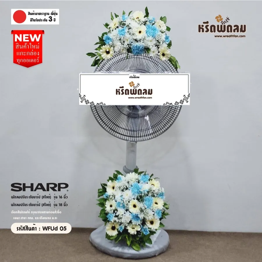 พวงหรีดพัดลมยี่ห้อ SHARP ขนาด 16 นิ้ว และ 18 นิ้ว ประดับดอกไม้สด โทนสีฟ้า-ขาว จัดตามแบบ หรือเปลี่ยนโทนสีได้ เลือกสีพัดลมได้ (กรุณาสอบถามก่อนสั่งซื้อ)