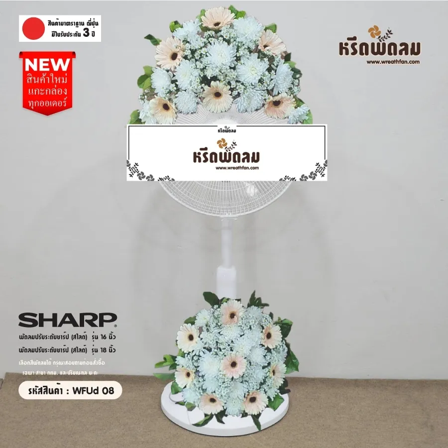 พวงหรีดพัดลมยี่ห้อ SHARP ขนาด 16 นิ้ว และ 18 นิ้ว ประดับดอกไม้สด โทนเหลืองอ่อน-ขาว จัดตามแบบ หรือเปลี่ยนโทนสีได้ เลือกสีพัดลมได้ (กรุณาสอบถามก่อนสั่งซื้อ)