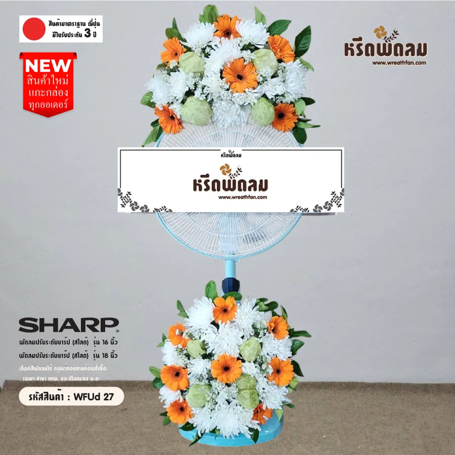 พวงหรีดพัดลมยี่ห้อ SHARP ขนาด 16 นิ้ว และ 18 นิ้ว ประดับดอกไม้สด โทนสีส้ม-ขาว จัดตามแบบ หรือเปลี่ยนโทนสีได้ เลือกสีพัดลมได้ (กรุณาสอบถามก่อนสั่งซื้อ)