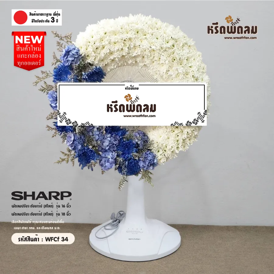 พวงหรีดพัดลมยี่ห้อ SHARP ขนาด 16 นิ้ว และ 18 นิ้ว ประดับดอกไม้สด โทนขาว-น้ำเงิน จัดตามแบบ หรือเปลี่ยนโทนสีได้ เลือกสีพัดลมได้ (กรุณาสอบถามก่อนสั่งซื้อ)